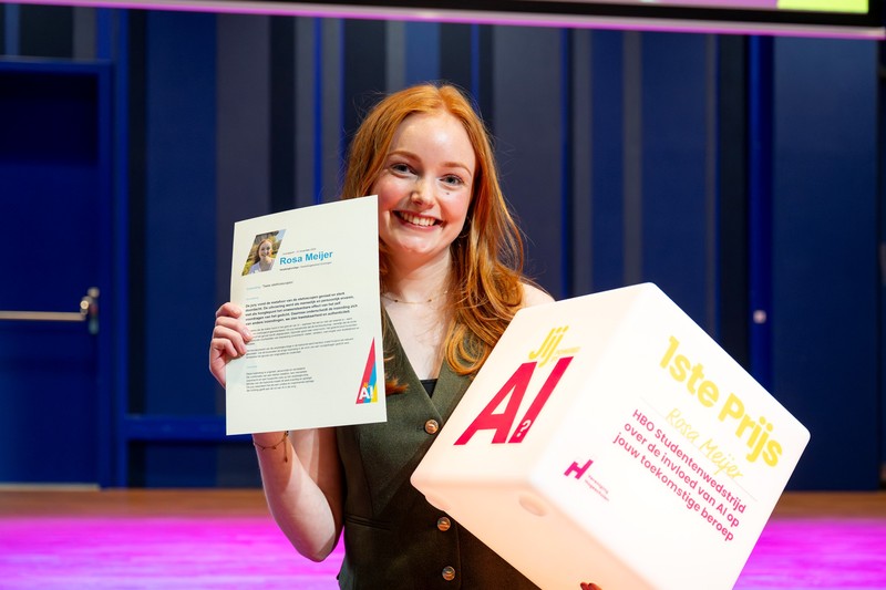 Tijdens de hbo-studentenwedstrijd ‘Jij powered by AI?’, die vandaag (woensdag 12 november) werd afgesloten, is Rosa Meijer, student Verpleegkunde aan de Hanzehogeschool Groningen, uitgeroepen tot winnaar. Volgens het juryrapport is haar inzending “origineel, persoonlijk en verrassend.” De combinatie van een sterke metafoor, een menselijke voordracht en een hoopvolle visie op het verpleegkundig beroep van de toekomst maakt het werk volgens de jury “krachtig en gelaagd.” De jury waardeert het als een unieke en inspirerende bijdrage die richting geeft aan de rol van AI in de zorg.